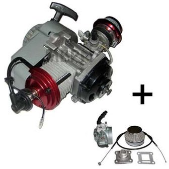 Compleet motorblok voor alle Chinese minibikes met een 47/49cc motor. Dit blok is reeds voorzien van BigBore cilinder en HOGEDRUK kop, Dellorto imi Carburateurkit met race Powerfilter en aluminium trekstarter. Dus oude blok eruit, nieuwe er in, gaskabel en benzineslang aansluiten en rijden!!! Getuned: 1 - Hogedruk cilinderkop en 44mm BigBore cilinder / 2 - Aluminium trekstarter / 3 - Dellorto imi 14mm carburateurkit / 4 - Race Powerluchtfilter ---> let op: wordt alleen bij MiniBikeStunter geleverd met langere gaskabel!